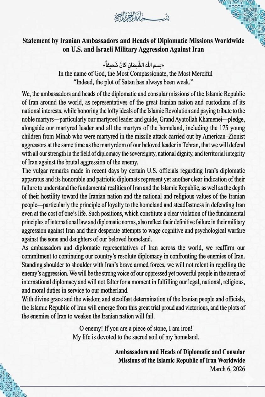 Statement by Iranian Ambassadors and Heads of Diplomatic Missions Worldwide on U.S. and Israeli Military Aggression Against Iran