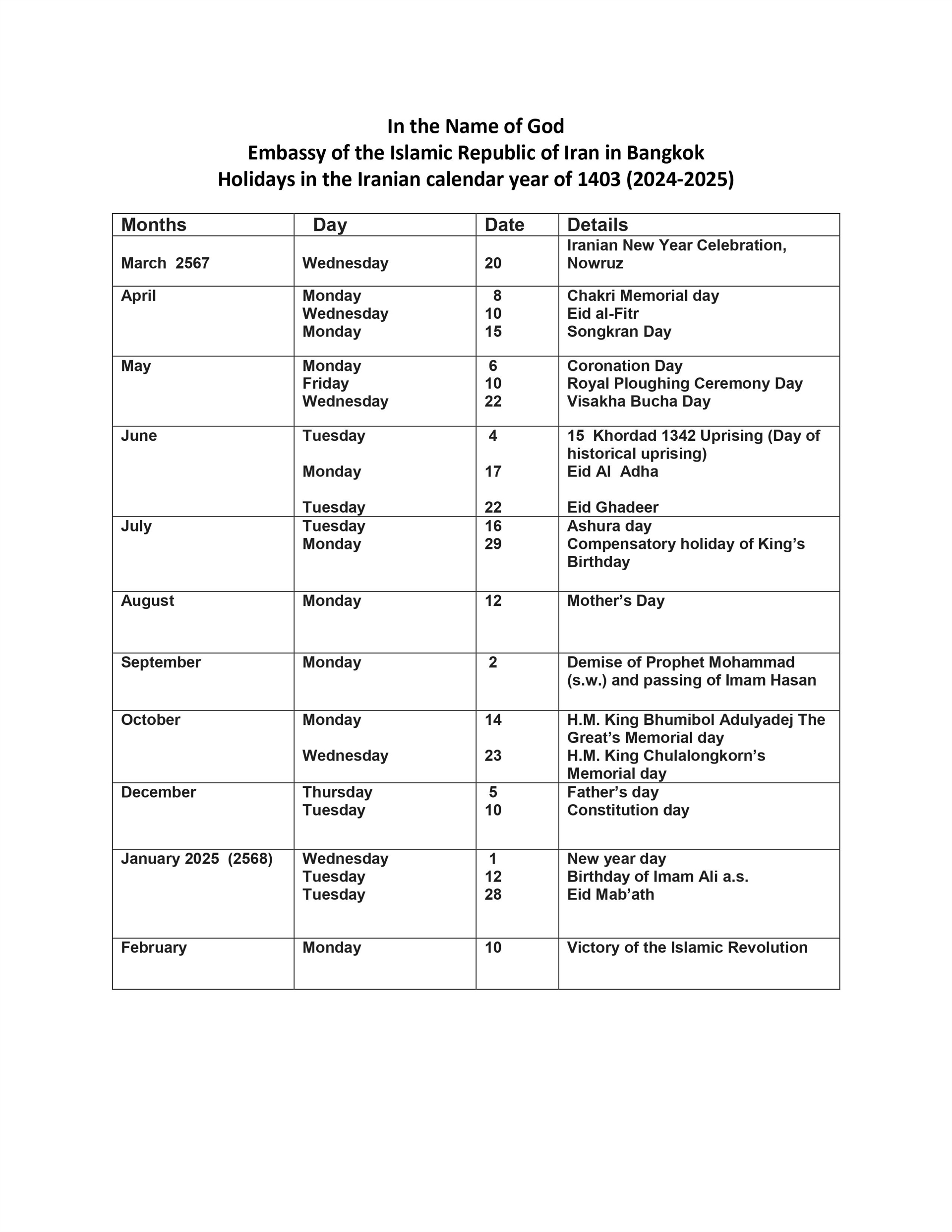 Embassy’s holidays in Iranian calendar year of 1403 (2024-2025)
