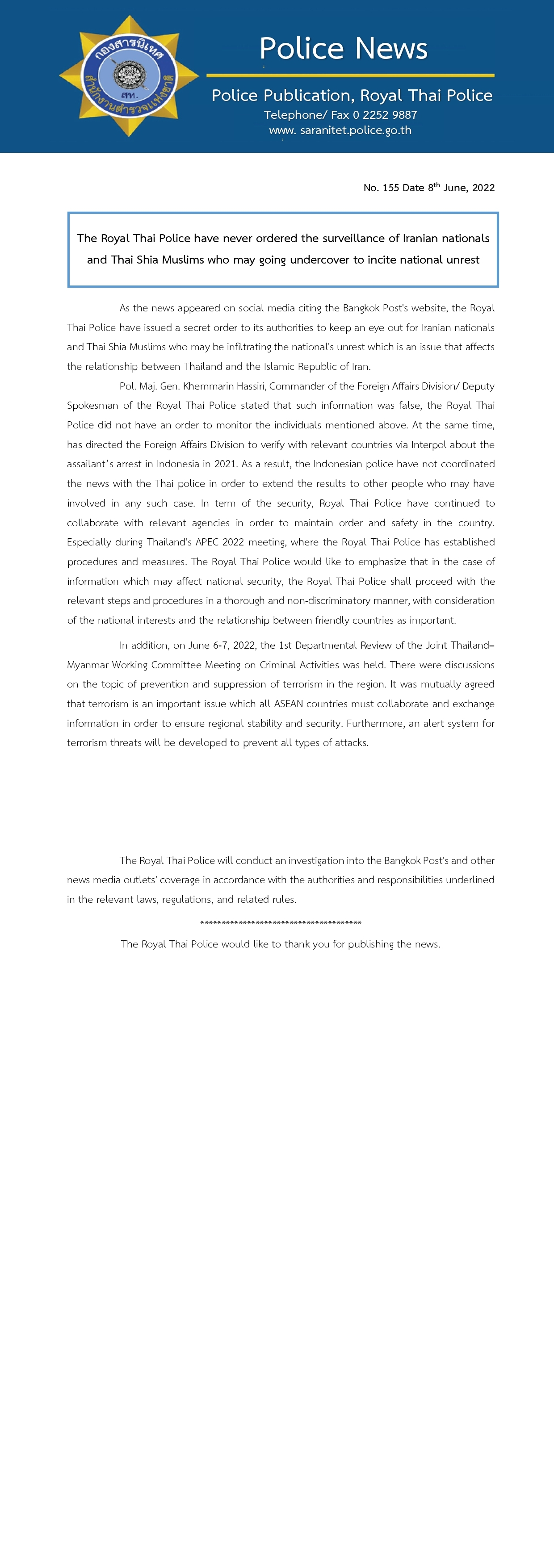 همچنین در این بیانیه آمده است که پلیس، تحقیقاتی را در خصوص مطلب روزنامه بانکوک پست انجام خواهد داد.