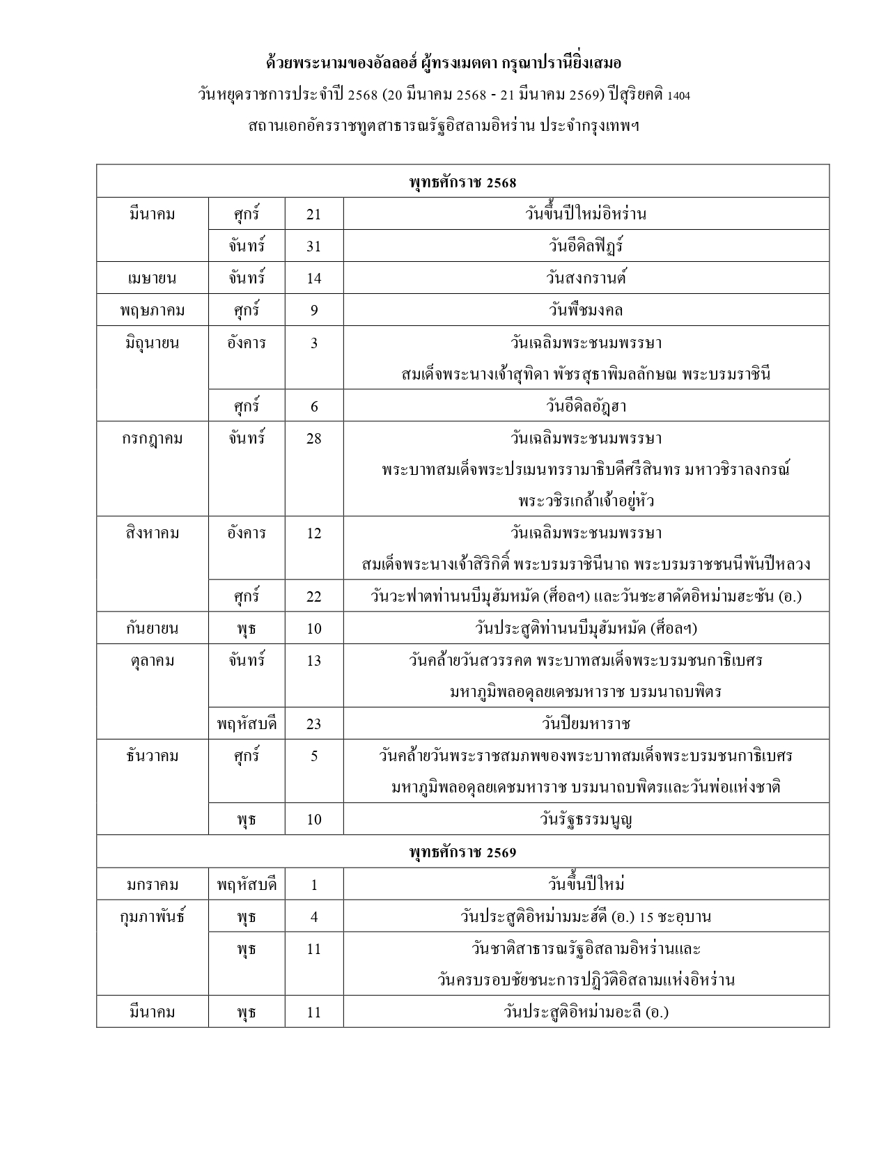 วันหยุดราชการประจำปี 2568 (20 มีนาคม 2568 - 21 มีนาคม 2569) ปีสุริยคติ 1404 สถานเอกอัครราชทูตสาธารณรัฐอิสลามอิหร่าน ประจำกรุงเทพฯ